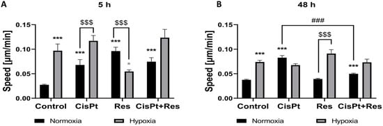 Hypoxia-dependent modification of migration of A2780 cells upon cisplatin, resveratrol, and the combination treatments. The cells were treated with cisplatin (CisPt), resveratrol (Res), and both in combination (CisPt+Res) according to Section 4.4: Establishment of Hypoxic Culture Conditions and Experimental Outline. The cell migration activity was recorded for 48 h with a time step of 20 min at 5× magnification, using Zeiss Axio Observer microscope Z1/7–software Zen 2.6 (Blue edition). The speed of 50 single non-proliferating cells after treatment with CisPt, Res, and CisPt+Res under normoxic and hypoxic conditions was analyzed (A) at the 5 h time-point and (B) at the 48 h time-point. The results of three independent replicates are presented with the mean values ± SEM (total n = 150) with *** p < 0.001, * p < 0.05, vs. normoxia control (black asterisk) and vs. hypoxia control (grey asterisk); $$$ p < 0.001, comparing the normoxia group with the hypoxia group; and ### p < 0.001, CisPt alone vs. CisPt+Res.