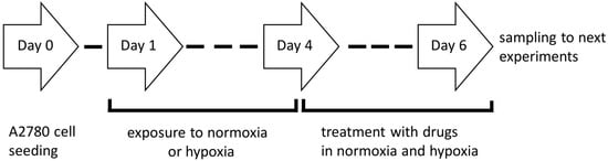 To estimate the role of hypoxia, A2780 cells were seeded and initially cultured for 24 h in normoxia (in a standard incubator CO2, 37 °C, pO2~19%, 95% humidity). Then, cells were transferred to a hypoxia chamber (5% CO2, 37 °C, pO2 = 1%, 95% humidity; BioSpherix, Xvivo System Model X3, USA) or kept in normoxic conditions, and the culture medium (preconditioned under normoxia or hypoxia for 24 h before culturing) was added. After 72 h exposure of cells to normoxia or hypoxia, half of the medium was removed and replaced by fresh medium (preconditioned to the appropriate oxygen tension 72 h before adding to the culture) with CisPt, Res, or their combination (CisPt+Res) for 48 h; the general scheme of experiments is shown on Figure 9. To avoid excessive cytotoxicity, especially in drug mixtures, the compounds were used at doses of IC25. Cells in 0.1% DMSO medium served as a control. Hypoxic conditions (pO2 = 1%) were obtained in a hypoxia chamber continuously flushed with 5% CO2 and 94% N2. Partial oxygen pressure was monitored during incubation using a CO2/O2 gas controller (BioSpherix, 37 °C, 95% humidity).
