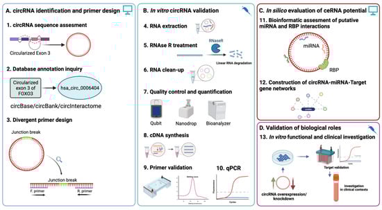 The characterization of circRNA-miRNA-mRNA interaction networks became a popular model of study for the functional investigation of circRNAs, which have now been proven to be involved in multiple developmental processes [], oncologic malignancies [,], and many others []. While there is still a high degree of variability and inconsistency in identification methods, validation using qRT-PCR has remained the gold standard in most functional studies of the circRNA []. Yet, many recent studies highlighted a need for more methodological consistency regarding the investigation methods. Here, we address these discrepancies by providing an in-depth description and step-by-step illustration of the stages required for the accurate characterization, validation, and data analysis of circRNAs using qRT-PCR to contribute to the methodological consensus. First, we will highlight the utility of database annotation and circRNA regarding sequence assessment based on parental transcripts and genomic coordinates, highlighting structural-specific aspects to be considered in the design and validation of convergent primers for qRT-PCR quantification. Then, we focus on several critical elements in optimizing processing steps, such as RNAse R treatment efficiency, analyzing circRNA enrichment following treatment, and possible correlations with the expression of their respective parental genes. Lastly, we will exemplify the utility of current online database resources for identifying potential miRNA targets, an important step for circRNA functional investigations. An overview of the workflow and experimental design is presented in Figure 1, highlighting both the bioinformatic and in vitro validation steps.