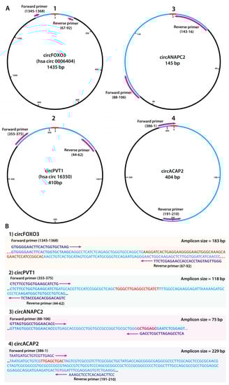 Map and sequence characteristics of the circular RNAs utilized in the study; (A) Circularized sequence maps of the circRNAs with highlighted primer binding positions and directions (in purple) and amplicons (in blue); (B) Amplicon sequence size and characteristics; primer binding positions and sequences (purple), complete sequence (blue) and highlighted junction sequence (in red) for all investigated circRNAs.