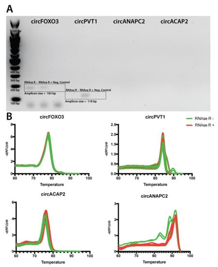 We first confirmed the specificity of the primers using touchdown PCR and demonstrated the size of the resulting amplicons using 2% EtBr-stained agarose gel electrophoresis. We confirmed that the resulting PCR products have the expected size in the case of circFOXO3 (183 bps) and circPVT1 (118 bps), with no other unspecific bands in either RNAse R− or R+ treated samples. Interestingly, the circPVT1 amplicon could not be detected in the RNAse R untreated sample, indicating a post-treatment enrichment of the transcript in the RNA pool. More so, for the pseudo-circRNAs, circANAPC2 and circACAP2, we could not observe any related products indicative of a superficial expression level, undetectable, using EtBr staining. As an additional confirmation, we evaluated the specificity of primers via the melting curve analysis resulting from the qRT-PCR using the cDNA from RNAse R treated and untreated RNA. This indicated a single melting peak in most reactions and replicated. At the same time, in the case of circPVT1 and circANAPC2, amplifications from the RNAse R+ cDNA (Figure 3B) produced more specific melting peaks when compared to the untreated samples. Overall, we confirm the amplification specificity of the primers and indicate that RNAse R treatment can influence circRNA amplification specificity.