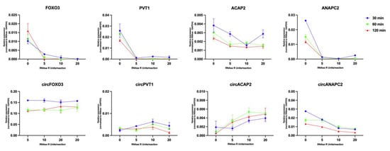 Linear RNA digestion using RNAse R is a commonly utilized step in processing the RNA samples for either sequencing or qRT-PCR investigations focused on circRNAs. In this case, we wanted to evaluate the linear transcript depletion efficiency and effects on circRNA detection. As such, we prepared individual reactions corresponding to four concentrations (0, 5, 10, and 20 units/reaction) of RNAse and three different time points (0, 60, and 120 min.) and proceeded to evaluate the effect of the various treatments on all investigated circRNAs and their parental linear transcripts.