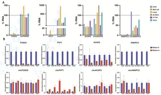 First, we wanted to validate whether the expression levels of the circRNAs are reflected by their parental gene’s expression level, an idea consistent with our reported comparative expression level analysis. As such, we proceeded to investigate the enrichment percentages as a form of direct quantification of the effect of the RNAse R treatment (10 units/reaction) level in multiple lung cancer cell lines (Figure 5, Supplemental Table S4). Overall, we observed consistently elevated expression of both mRNA and derived circRNA in the case of only several samples, such as in H522 cells for circFOXO3 and circACAP2 and SK-MES1 cell line for circPVT1, indicating that, besides expression patterns, the ratio between circRNA and parental transcript is primarily cell-type specific (Supplemental Figure S4).