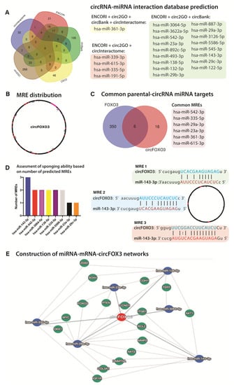 miRNA interaction-based database construction of circFOXO3-miRNA-target gene networks (A) Venn diagram depicting the overlapped putative miRNA candidate list obtained from circRNA databases; (B) Example of distribution of MREs in the sequence of circFOXO3; (C) Venn diagram depicting the overlapping miRNAs potentially competitively interacting with both the linear FOXO3 mRNA and circFOXO3; (D) Number of MREs for each miRNA in the sequence of circFOXO3 (left) and exemplified distribution of MREs for miR-143-3p in the sequence of circFOXO3 (E) Exemplified constructed circRNA-miRNA-target gene focusing on the primary miRNAs interacting with circFOXO3 and their putative target genes.