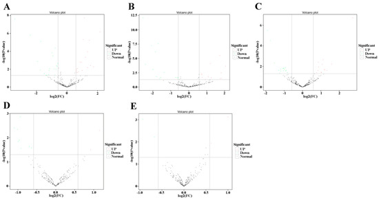 Volcano plot of DE miRNAs in (A) R5d vs. E5d; (B) R6d vs. E6d; (C) R7d vs. E7d; (D) R8d vs. E8d; and (E) R-Pw vs. E-Pw.