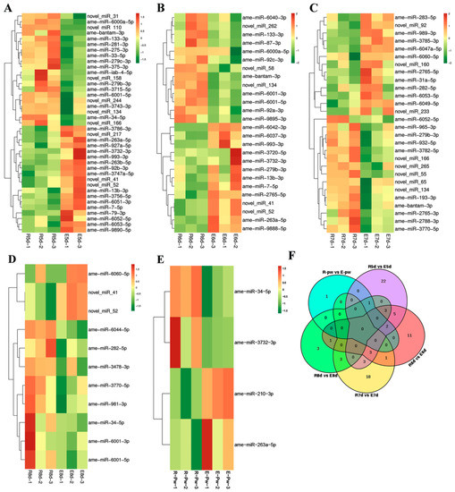 20-Hydroxyecdysone (20E)-responsive miRNAs identified by small RNA sequencing. Hierarchical cluster analysis in (A) R5d vs. E5d; (B) R6d vs. E6d; (C) R7d vs. E7d; (D) R8d vs. E8d; and (E) R-Pw vs. E-Pw. The green and red rectangles indicate downregulated and upregulated miRNAs, respectively. Venn plot (F) of differentially expressed (DE) miRNAs among all examined samples. Numbers represent the identified DE miRNAs in pairwise comparisons.