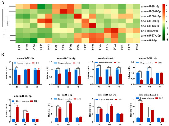 Validation of eight selected differentially expressed (DE) miRNAs by RT-qPCR. (A) Hierarchical cluster analysis of eight selected DE miRNAs at different developmental stages in honeybees. (B) Determination of eight selected DE miRNAs by RT-qPCR. Three biological replicates and three technical replicates were performed. * p < 0.05, ** p < 0.01 (Student’s t-test). The values are means ± SEM.