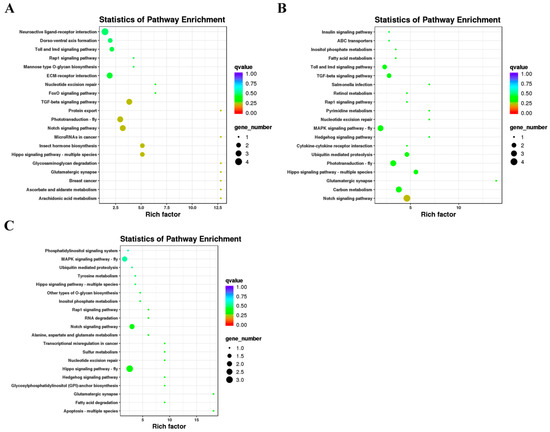 KEGG pathways enrichment analysis of target genes in (A) R5d vs. E5d; (B) R6d vs. E6d; and (C) R7d vs. E7d.