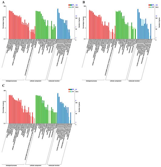 Based on the sequences of the miRNAs (known and novel), miRanda [45] and targetScan [46] were used to identify the targets of miRNAs and run by default parameters. The final targets were intersected with the gene sets identified by two softwares. The sequences of the predicted target genes were compared with those of the non-redundant (NR) [60], Swiss-Prot [60], Gene Ontology (GO) [61], Clusters of Orthologous Groups of Proteins (COG) [62], Kyoto Encyclopedia of Genes and Genomes (KEGG) [63], Eukaryotic Orthologous Groups (KOG) [64], and Pfam [65] databases using BLASTX searches with an E-value cutoff of <1.00 × 10−5 to obtain annotation information.