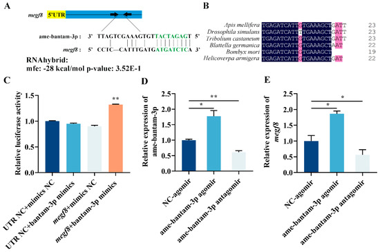 In vitro dual-luciferase reporter assays of miRNA–mRNA interactions in worker bee larvae. (A) Ame-bantam-3pbinding sites in the megf8 gene as predicted by RNAhybrid. The blue area is the coding sequence (CDS) and the yellow area is the untranslated region (UTR). The seed sequence and complementary bases are highlighted in green. (B) Multiple alignment of ame-bantam-3p in insects and Apis mellifera. (C) Relative luciferase activity in the dual-luciferase assay. UTR NC represents a reporter without the target sequence and mimics NC represents mimic controls. The mean ± SEM of the relative luciferase expression ratio (firefly luciferase/Renilla luciferase, Luc/R-luc) was calculated from three biological replicates (Student’s t-test, n = 3) and compared with the negative control (NC). The expression level of ame-bantam-3p (D) and megf8 (E) in larvae injected with ame-bantam-3p agomir, ame-bantam-3p antagomir or NC. Reverse transcription quantitative polymerase chain reaction (RT-qPCR) data are presented as means ±SEM of triplicate samples. * p < 0.05, ** p < 0.01 (Student’s t-test).