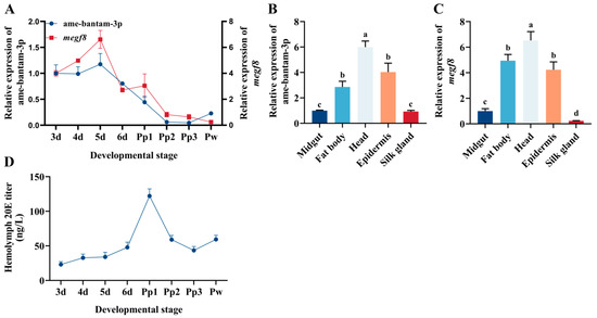 (A) The expression levels of ame-bantam-3p and megf8 in the larval–pupal developmental stages. The expression levels of ame-bantam-3p (B) and megf8 (C) in isolated tissues. Vertical bars represent the mean ± SEM (n = 5) and letters represent significant differences (p < 0.05). Relative expression levels were denoted as fold-change over that of the internal controls U6 and β-actin, respectively. Each point and histogram bar represents the relative expression, the error bars indicate SEM. (D) Hemolymph 20-hydroxyecdysone (20E) titers in larval–pupal developmental stages of the honeybee. Each point indicates the mean ecdysone concentration ± SEM.
