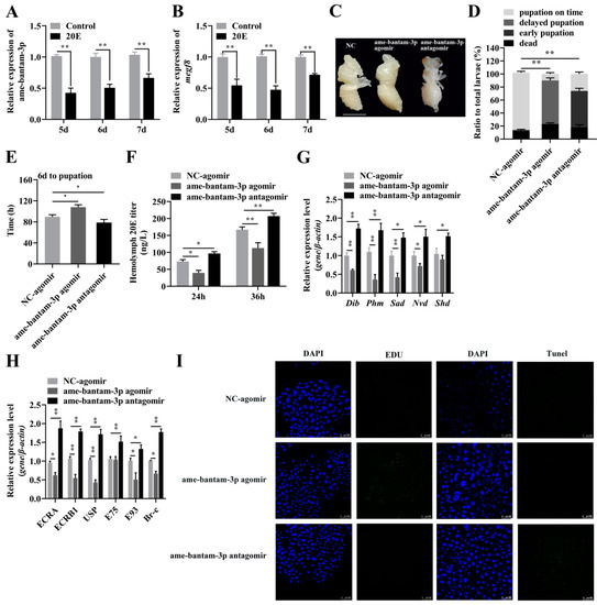 Hierarchical clustering analysis based on the TPM method showed that larvae of the same day old treated with 20E were clustered in the same clade and separated from the respective controls (Figure 2A–E). Furthermore, some miRNAs, such as ame-bantam-3, miR-276b-3p, ame-let-7-5p, and ame-miR-282-5p, were differentially expressed at different developmental stages (Figure S4), indicating that these miRNAs may be involved in the larval to pupal transition of honeybees. Venn diagram analysis showed that the levels of ame-bantam-3p, miR-279b-3p, and miR-6001-5p were significantly decreased in five-day-old, six-day-old, and seven-day-old larvae after 20E treatment, indicating that these miRNAs were negatively regulated by 20E.Ame-bantam-3p was found to be the most abundant miRNA in all three developmental stages. Meanwhile, the expression of some miRNAs (e.g., ame-miR-7-5p, ame-miR-13b-3p, ame-miR-993-3p, and ame-miR-263a-5p) was upregulated in five-day-old and six-day-old larvae after 20E treatment (Figure 2F). The expression patterns of these miRNAs suggested that they may play a significant role during larval–pupal transformation and metamorphosis in the honeybee and that 20E regulates the expression of metamorphosis-associated miRNAs. Based on all the above results, we subsequently focused on ame-bantam-3p, and we examined its function during honeybee metamorphosis.