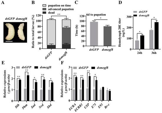 Injection of dsRNA from megf8 by the six-day old larvae inhibits ecdysteroid synthesis and represses 20E signal in A. mellifera. (A) Phenotypes after dsmegf8 injection; the ruler represents 0.3 cm. (B) Percentage distribution of different phenotypes. (C) Statistical analysis of the time of development of six-day old larvae to pupae. (D) The determination of the 20E titer 24 and 36 h after dsmegf8 injection. The expression levels of genes essential for ecdysteroid synthesis (E) and 20E signaling pathway genes (F) 24 h after dsmegf8 injection. * p < 0.05, ** p < 0.01 (Student’s t-test). Error bars indicate the mean ± SEM (n = 5).