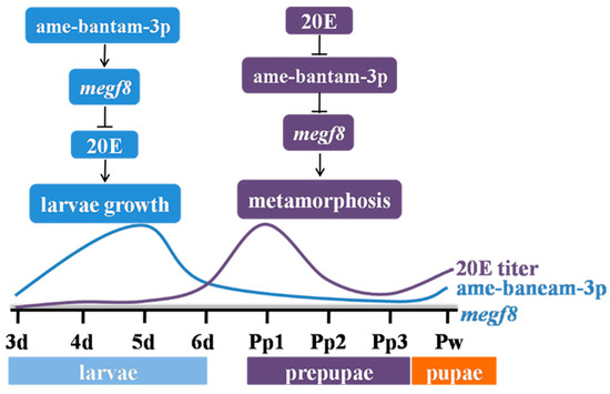 Some miRNAs are components of additional systemic signaling pathways in insects, including the 20E, insulin, stress, immune, and circadian pathways [41]. Bantam is involved in the regulation of insect metamorphosis by targeting spook and spookier in the ecdysteroid synthesis pathway [13,42]. Moreover, bantam promotes systemic growth by inhibiting the synthesis of the steroid hormone ecdysteroid [13]. In summary, we present evidence that both conserved and lineage-specific miRNAs participate in the regulation of metamorphosis in insects by directly controlling ecdysteroid biosynthesis. In our study, we found that the disruption of ecdysteroid biosynthesis through the use of ame-bantam-3p agomir led to a decrease in the expression levels of the dib, phm, sad, nvd, and shd genes, which encode enzymes required for ecdysteroid biosynthesis, whereas ame-bantam-3pantagomir injection increased the expression of these genes. Furthermore, 20E signaling was also reduced following ame-bantam-3pagomir treatment, as evidenced by the expression levels of genes coding for nuclear receptors (ECRA, ECRB1, and USP) and those of 20E primary response genes (i.e., the transcription factor-encoding genes Br-C, E75, and E93) (Figure 8). In addition, by employing RNA interference, we found that megf8 is also involved in the regulation of ecdysteroid synthesis and 20E signaling pathways. These results showed that the expression of these 20E response genes is dependent on the effects of ame-bantam-3p on megf8 expression. Meanwhile, ame-bantam-3p agomir treatment upregulated the expression of megf8 and resulted in pupation failure and the promotion of cell proliferation and, consequently, body growth, which blocked larval metamorphosis. Bantam represses apoptosis directly by inducing the expression of DIAP1 and indirectly by inducing the expression of Yki, which, in turn, suppresses the expression of the proapoptotic gene hid [16]. Additionally, we observed a greater number of proliferating fat body cells in ame-bantam-3p agomir-injected larvae than in larvae injected with NC agomir, as detected by EdU staining. The dMegf8 gene is essential for Drosophila viability and the loss of its function results in lethality during larval stages, and the phenotype of dMegf8 larval mutants is similar to that of some BMP signaling mutants, such as impaired formation of denticles and bristle [30]. In the present study, megf8 knockout caused early pupation of larvae and significantly increased the expression levels of genes involved in ecdysteroid synthesis and 20E signaling-related genes in honeybee larvae (Figure 9). Accordingly, our data suggest that, as in Drosophila, ame-bantam-3p is involved in larval development by inhibiting 20E release. Ame-bantam-3p plays an important role in positively regulating the levels of the megf8 gene, thus contributing to the homeostasis of 20E signaling pathway-associated genes during larval–pupal development in the honeybee. This study may provide novel insights into miRNA/gene interactions during metamorphosis in the honeybee.