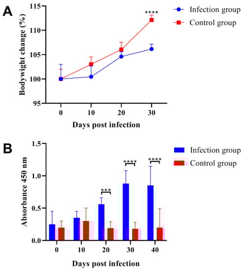 2.1. Parasitic Infection Decreased Body Weight and Induced Specific Antibody Production