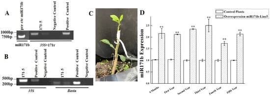 Sweet orange pre-ctr-miR171b was successfully cloned (Figure 1A) into a TA-cloning vector using a pair of 171f/171r primers. The insert was excised from the TA vector using double enzyme digestion and inserted into the pFGC5941 over-expression vector. Transgenic citrus plants were obtained using Agrobacterium tumefaciens-mediated transformation (Figure 1B). A total of 16 Basta-resistant transgenic buds were grafted onto rootstocks. DNA was extracted from the leaves of the transgenic lines when 5–8 true leaves were present, and the pre-ctr-miR171b transgene was detected via PCR. The transgenic plant was eventually identified and designated as 171-5 (Figure 1C).