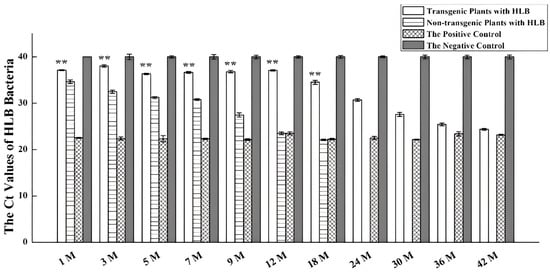 Quantitative real-time PCR detection of HLB in transgenic plants overexpressing miR171b. The horizontal axis represents detection time points following the inoculation of HLB. The vertical axis represents Ct values of the HLB-specific amplicon. Experiments were repeated twice with similar results. ** indicates p values of <0.01 compared with the non-transgenic plants. The M on the X-axis means the month.