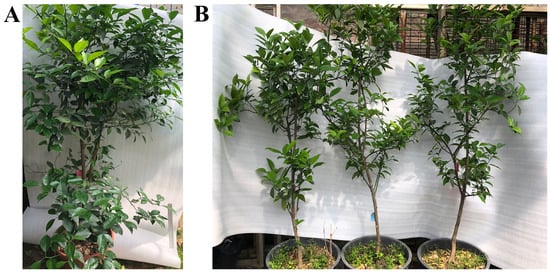Citrus transformation was performed according to the method described by Cheng et al. [69] using Citrus reticulata Blanco “tangerine” epicotyls as explants. Agrobacterium infection solution was prepared and the OD600 was adjusted to 0.5. The epicotyls of citrus were cultured in the dark, and the epicotyls were diagonally cut into sections of 1~2 cm, which were placed in Agrobacterium infection solution (containing 100 µM Acetosyringone) and infected for 30 min. The explants were removed and incubated in MS medium at 25 °C for 3 days. The explants were transferred to screening medium containing 10 mg/L Basta and cultured at 28 °C for 30 to 45 days. When the resistant regeneration buds had grown to 2 cm, the whole regeneration buds, together with the epicotyls, were grafted onto the stocks. Genomic DNA was isolated from fully expanded leaves of the regenerated plants and examined for the presence of the transgene via PCR using the pFGC5941 vector specific primer pair P1/P2 flanking the expression cascade. Further verification was carried out using PCR with the upstream 35S-F primer and the downstream 171r primer. The PCR-positive transgenic plants were propagated by grafting onto red tangerine rootstocks. The graft-propagated transgenic plants were re-examined using 35S-F/35S-R and Bar-F/Bar-R primers. Non-transgenic plant buds were simultaneously graft-propagated and used as controls.