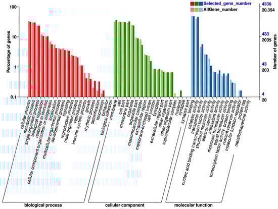 Based on gene ontology (GO) annotations, all of the DEGs were grouped into three major categories: biological processes, cellular components, and molecular functions. In the group of biological processes, most DEGs were involved in cellular processes, metabolic processes, single-organism processes, biological regulation, response to stimulus, cellular component organization or biogenesis, localization, multicellular organismal processes, developmental processes, signaling, reproductive processes, multi-organism processes, reproduction, immune system processes, growth, rhythmic processes, detoxification, and locomotion (Figure 4). In the functional group of cell components, most DEGs were associated with the cell, cell part, membrane, membrane part, organelle, organelle part, macromolecular complex, extracellular region, membrane-enclosed lumen, cell junction, symplast, extracellular region part, other organism, other organism part, supramolecular complex, and nucleoid. Lastly, in the group of molecular function, most DEGs were involved in binding, catalytic activity, transporter activity, nucleic acid binding transcription factor activity, structural molecule activity, electron carrier activity, antioxidant activity, molecular transducer activity, signal transducer activity, transcription factor activity, protein binding, nutrient reservoir activity, and molecular function regulation (Figure 4).