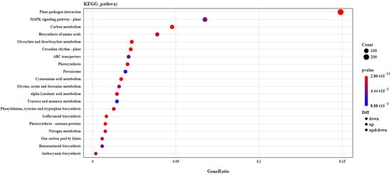 Based on the comparison of the different groups, with the p value ≤ 0.05 as the standard, the enriched KEGG pathways are shown in Figure 5 and Supplemental Table S5. Most of the identified KEGG pathways were found to mainly be involved in photosynthesis, photosynthetic antenna proteins, plant–pathogen interactions, the MAPK signaling pathway, ABC transporters, and so on (Figure 5).