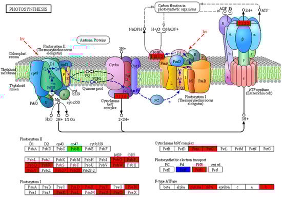 The KEGG map of the photosynthesis pathway in the non-transgenic plants versus the transgenic plants. The red means the DEGs were up-regulated, the green means the DEGs were down-regulated, and the blue means both up- and down- regulated.
