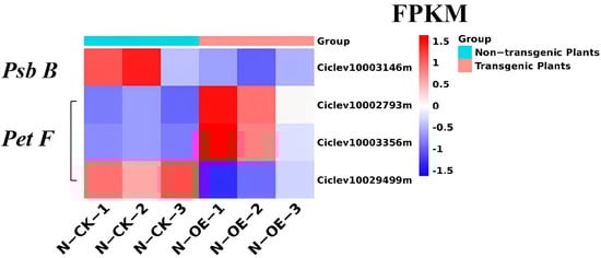 The FPKM of the DEGs in the photosynthesis pathway in the non-transgenic plants versus the transgenic plants. The N−CK−1−3 means the non-transgenic plants, the N−OE−1−3 means the transgenic plants. Other figures were the same.