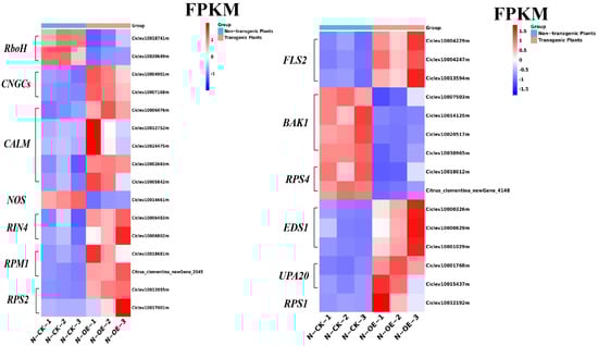 The FPKM of the DEGs in the plant–pathogen interaction pathway in the non-transgenic plants versus the transgenic plants.