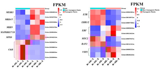 In plants, the MAPK cascades were also involved in a variety of physiological, developmental, and hormonal processes. As shown in Figure 9, in the ethylene pathway of the transgenic plants, the ETR (Ciclev10004385m, Ciclev10018972m), which encodes an ethylene receptor and acted upstream of CTR1, was down-regulated by 2.26 and 3.16 times, and the ethylene-related genes, ERF (Ciclev10005820m, Ciclev10021622m) and EBF1/2 (Ciclev10007708m), were up-regulated and down-regulated, respectively. The DEGs in this pathway, such as ChiB (Ciclev10026057m, Ciclev10028964m, Ciclev10028959m and Ciclev10028831m) and RAN1 (Ciclev10014141m), were all down-regulated. In the jasmonic acid pathway, the wounding-inducible expression of the VSP2 (Ciclev10009222m, Ciclev10026223m) gene was up-regulated in the transgenic plants, and the stress-induced gene MYC2 (Ciclev10007937m) was down-regulated. The FPKM of the MYC2 gene ranged from 9 to 3, with low values. In the abscisic acid pathway, the related DEGs were all activated, which suggests that the hormones in the MAPK cascades were activated to enhance plant resistance.