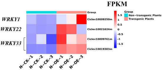 The FPKM of the WRKYs in the non-transgenic plants versus the transgenic plants.