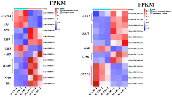 The FPKM of the DEGs in the plant hormone signal transduction pathway in the non-transgenic plants versus the transgenic plants.