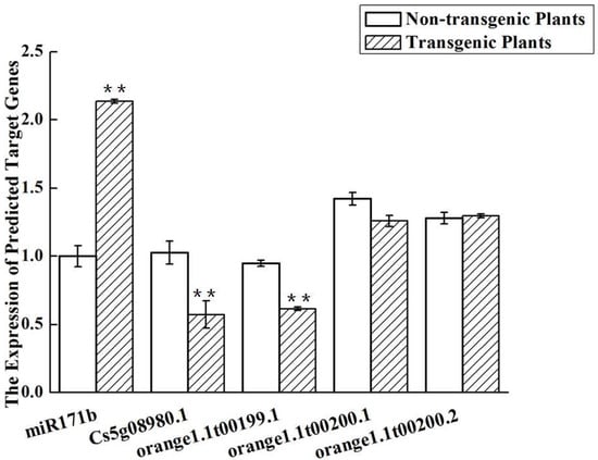 qPCR was used to compare the expression of the assumed target genes of miR171b in the transgenic and non-transgenic plants. Two of the four predicted targets were significantly downregulated (Figure 12). More specifically, orange1.1t00199.1 expression was reduced by 1.6-fold and Cs5g08980.1 expression was reduced by approximately 2-fold in the transgenic plants. The expressions of the other two predicted target genes did not differ significantly. The Cs5g08980.1 and the orange1.1t00199.1 genes were all the target genes of miR171b.