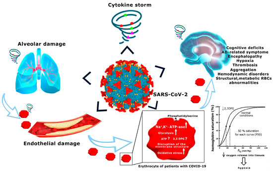 In recent years, advanced research into RBCs isolated from the blood of patients suffering from various diseases has revealed highly significant positive correlations between numerous biochemical and morphological aberrations in RBCs and the development of various types of dementia syndromes [70,74,75,76,162,245,246,247,248,249]. In particular, it became possible to formulate the vascular/erythrocytic hypothesis of the development of energy crisis in the brain, neurodegeneration, and cognitive deficit at onset of AD. These disorders are considered to be stimulated by hypoperfusion and impaired RBC metabolism and function limiting the continuous supply of oxygen to the brain [33,61,67,162,250,251,252,253]. SARS-CoV-2 infection is no exception. Considering the importance of attitudes towards the development of oxygen deficiency in the brain, the identification and quantification of RBC parameters is instrumental in gaining insight into the reasons for the development of AD-like neurological symptoms in patients with severe COVID-19, at any age [49,54,254,255,256].