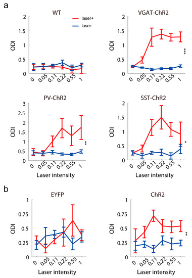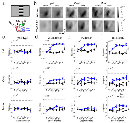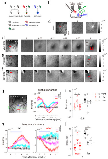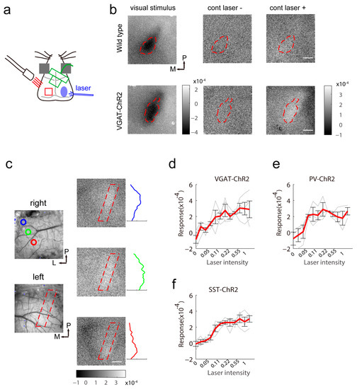 Compared with excitatory neurons in the cortex, inhibitory neurons have highly heterogeneous cell types that are characterized by their unique protein expression and roles in neuronal circuits [17,18,19]. First, we optogenetically activated different inhibitory neurons in the visual cortex and recorded the response using intrinsic signal optical imaging (Figure 1a,b). VGAT-ChR2-EYFP mice expressing channelrhodopsin-2 (ChR2) directed to GABAergic interneuron populations by the mouse vesicular GABA transporter (VGAT) promoter were used for activation of global inhibitory cells [20]. Wild-type littermate mice were used as controls. To achieve selective activation of subpopulations of inhibitory cells, especially cells expressing pavalbumin (PV, Pvalb) or somatostatin (SST), Pvalb-IRES-Cre and Sst-IRES-Cre transgenic mice were crossed with line Ai32 (Rosa-CAG-LSL-ChR2(H134R)-EYFP-WPRE) [21,22]. The bred mice used in our study included C57BL/6J (control), VGAT-ChR2_EYFP (VGAT-ChR2), PV::Ai32 (PV-ChR2) and SST::Ai32 (SST-ChR2) mice.