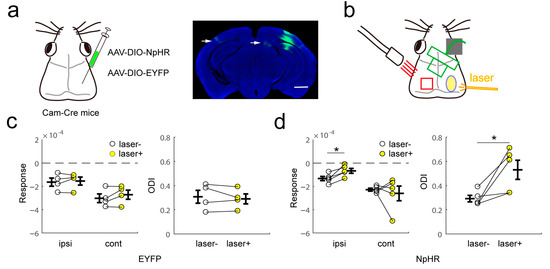 Ipsilateral eye response depression and ocular dominance change induced by optogenetic inhibition of contralateral excitatory neurons. (a) Virus injection (left) and halorhodopsin protein expression in excitatory neurons in the visual cortex (right). The scale bar is 2 mm (right). The white arrow shows the fiber right visual cortex. (b) Schematic of intrinsic signal optical imaging and laser stimuli. The intrinsic signal optical imaging recorded the signal of the left visual cortex, and light stimulation was located in the right visual cortex. (c,d) Response magnitude and ocular dominance index with or without laser stimuli in EYFP (c) and NpHR (d) mice (for d, ipsi, p = 0.0131, ODI, p = 0.0398, paired t-test). * p < 0.05.
