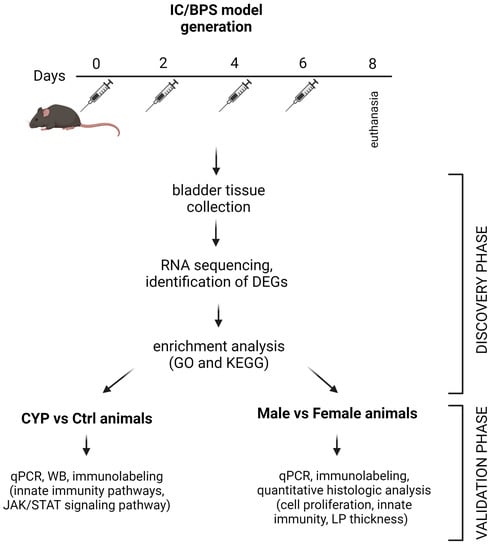 To date, the pathophysiology of IC/BPS remains largely unexplained, as it is a heterogeneous and complex disorder with unspecific clinical symptoms and pathologic findings that often overlap with other bladder-related pathologies []. Transcriptome profiling has become invaluable for research in IC/BPS as it is helping to elucidate the molecular mechanisms involved in disease development and progression. Animal models of IC/BPS still remain the main tool in the preclinical research of IC/BPS with an aim to discover novel diagnostic markers and therapeutic targets. Therefore, a detailed understanding of the models is crucial for successful interpretation and translation of the obtained data to the clinical setting. One of the most cited models of IC/BPS is the CYP-induced mouse model []. In our study, we created a mouse model mimicking IC/BPS through repeated low-dose CYP applications. The model was analyzed from the transcriptome to protein expression using RNA seq, qPCR, Western blot, and immunohistochemistry. We specifically focused on processes related to inflammatory and immune responses and showed the presence of sex-specific differences that importantly contribute to bladder tissue response to CYP-induced injury. To our knowledge, this is the first study implementing RNA seq technology in the analysis of an IC/BPS murine model induced with multiple CYP applications, which included animals of both sexes.