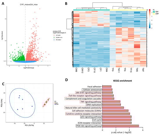 Effects of CYP treatment on the complete transcriptome of mouse bladders. (A) A volcano plot showing upregulated (red), downregulated (green), and unchanged (blue) genes in CYP vs. Ctrl mice. (B) Heatmap showing the 1000 most significantly DEGs in CYP (yellow; n = 6) vs. Ctrl (green; n = 6) animals (p adj < 0.05). Both rows and columns are clustered using correlation distance and average linkage. Lower expression is indicated in blue, and higher expression is indicated in red. CM: Ctrl male; CF: Ctrl female; TM: CYP-treated male; TF: CYP-treated female. (C) PCA of the 1000 most significantly DEGs in CYP (blue; n = 6) vs. Ctrl (red; n = 6) animals (p adj < 0.05), showing principal components 1 and 2 (PC1 and PC2) explaining 70.7% and 7.5% of the total variance, respectively. Unit variance scaling was applied to rows, and singular value decomposition (SVD) with imputation was used to calculate principal components. The prediction ellipses are such that with a probability of 0.95, a new observation from the same group will fall inside the ellipse. (D) KEGG enrichment analysis based on all DEGs in CYP (n = 6) vs. Ctrl (n = 6) animals (p adj < 0.05), showing relevant significantly enriched pathways, represented as −log10 of the p adj value. Processes involved in cell proliferation are circled in gray, while processes of immune response are circled in pink.