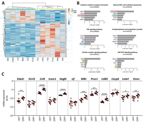 Next, we aimed to validate the differential expression of the most significantly DEGs by qPCR. We confirmed CYP-induced upregulation of the majority of the analyzed DEGs, specifically Eda2r (p = 0.0014), Ccl8 (p < 0.0001), Vegfd (p < 0.0001), Mlkl (p = 0.0001), Pros1 (p = 0.0052), Cd80 (p < 0.001), Casp8 (p = 0.0185), Irak4 (p = 0.0156), and Osmr (p = 0.0089). In contrast, we did not confirm the significant difference for Il1rl2, Icam1, and Lif (Figure 3C).