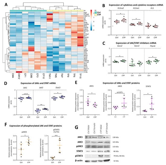 The JAK/STAT signaling pathway is activated in the bladders of CYP-treated animals. (A) Heatmap showing DEGs (n = 37) with p adj < 0.05 detected in the JAK/STAT signaling pathway by KEGG analysis comparing the CYP (yellow; n = 6 animals) vs. Ctrl (green; n = 6 animals) groups. Both the rows and columns are clustered using correlation distance and average linkage. Lower expression is marked in blue, and higher expression is marked in red. CM: Ctrl male; CF: Ctrl female; TM: CYP-treated male; TF: CYP-treated female. (B) qPCR validation of mRNA expression for cytokines and cytokine receptors (Il13ra2, Il13ra1, Il11), comparing CYP and Ctrl animals. Shown are the mean ± SD of negative Δ Ct determined for 10 animals per group. The qPCR analysis was not reliable for some DEGs identified as cytokines and cytokine receptors in the JAK/STAT signaling pathway (Il6, Il6ra, Il7, Il21r, Il3ra), therefore the results are not presented. (C) qPCR validation of mRNA expression for inhibitors of JAK/STAT signaling (Socs2, Socs3, Ptpn6), comparing CYP and Ctrl animals. Shown are the means ± SD of negative Δ Ct determined for 10 animals per group. (D) qPCR validation of transcript expression for the analyzed JAK and STAT molecules (Jak1, Jak3, Stat3), comparing CYP and Ctrl animals. Shown are the means ± SD of negative Δ Ct determined for 10 animals per group. (E) Expression of JAK and STAT proteins (JAK1, JAK3, and STAT3), determined by Western blot in Ctrl and CYP animals. Shown are the mean ± SD of relative protein expression normalized to β-actin for six animals per group. (F) The expression of phosphorylated JAK and STAT proteins (pJAK3, pSTAT3), determined by Western blot in Ctrl and CYP animals. Shown are the mean ± SD of relative protein expression normalized to β-actin for six animals per group. (G) Representative blots for the analysis of protein expression in six animals per group. * p < 0.05; *** p < 0.001.