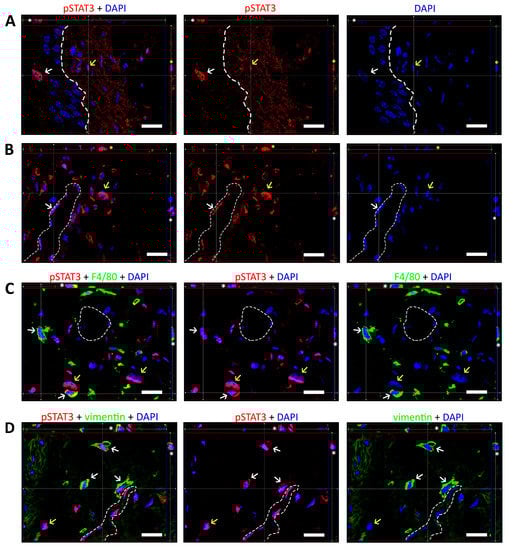 Representative confocal microscopy images of pSTAT3 nuclear translocation in the bladders of CYP-treated mice, selected from a series of images assembling a Z-stack. (A) Nuclear expression of pSTAT3 in superficial urothelial cells (white arrows) and interstitial cells of ULP (yellow arrows). A cut-view of the Z-stack shows pSTAT3 immunoreactions in the nucleus of a superficial urothelial cell (white asterisk) and an interstitial cell of the ULP (yellow asterisk). The dotted line indicates the urothelial basal lamina. (B) Nuclear expression of pSTAT3 in endothelial cells (white arrows) and the interstitial cells of DLP (yellow arrows). The Z-stack cut-view shows pSTAT3 immunoreactions in the nucleus of the endothelial cell (white asterisk) and interstitial cell of DLP (yellow asterisk). The dotted line indicates the endothelial basal lamina. (C) Colocalization of pSTAT3 and F4/80 immunoreactions in some of the interstitial cells of DLP (white arrows). A cut-view of the Z-stack shows pSTAT3 immunoreaction in the nuclei of macrophages (white asterisk). Yellow arrows point to interstitial cells that were not identified as macrophages. The dotted line indicates the endothelial basal lamina. (D) Colocalization of pSTAT3 and vimentin immunoreactions in some of the interstitial cells of DLP (white arrows). A cut-view of the Z-stack shows pSTAT3 immunoreactions in vimentin-positive mesenchymal cells (white asterisks). The yellow arrow shows an interstitial cell of non-mesenchymal origin. The dotted line indicates the endothelial basal lamina. Scale bars: 20 µm.