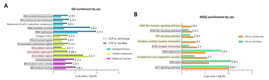 The CYP-induced enrichment of different processes is sex-specific. (A) GO enrichment analysis showing significantly enriched biological processes (blue), cell components (yellow), and molecular functions (green). Represented are −log10 p adj values for each process, comparing CYP males (dashed bars) and CYP females (empty bars). Numbers at the end of each bar represent the fold change between CYP males and CYP females in the p adj value of each enriched process. (B) KEGG enrichment analysis showing significantly enriched pathways (−log10 of p adj) comparing CYP males (green bars) and CYP females (orange bars). Numbers at the end of each bar represent the fold change between CYP males and CYP females in the p adj value of each enriched process. Processes involved in cell proliferation are circled in gray; processes of cell-extracellular space communication are circled in pink; and processes of innate immunity are circled in yellow.