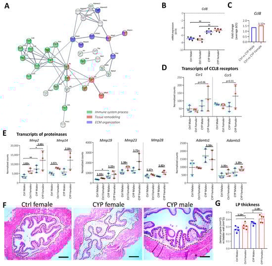CYP-induced changes in the bladders of female mice. (A) STRING network shows interactions between the putative proteins of the significantly DEGs identified in the enriched GO cellular components of the extracellular region, extracellular matrix, and extracellular region part (n = 56), displaying only interactions of high confidence (0.7). The proteins are known and predicted to interact in immune system processes (green), tissue remodeling (red), and EMC organization (blue). Disconnected nodes are hidden. (B) The mRNA expression of Ccl8 shows significant upregulation of the transcript in females after CYP treatment. Shown are the means ± SD of negative Δ Ct determined for five animals per group. (C) Differences in expression of Ccl8 mRNA in males and females after CYP treatment. The fold change of average Δ Ct in Ctrl vs. CYP males and Ctrl vs. CYP females is represented on the y axis. The number written above the bars indicates the fold change in mRNA expression in females vs. males after CYP treatment. (D) mRNA expression of Ccr1 and Ccr5 demonstrates a greater increase in females compared to males after CYP treatment. Shown are the mean ± SD of normalized read counts determined by RNA seq for three animals per group. (E) mRNA expression of selected proteinases (Mmp2, Mmp14, Mmp19, Mmp23, Mmp28, Adamts1, Adamts5) demonstrates a greater increase in females before and after CYP treatment compared to males. Shown are the mean ± SD of normalized read counts, determined by RNA seq for three animals per group. Blue lines indicate the fold change in average read counts between the groups (Ctrl males vs. Ctrl females and CYP males vs. CYP females). (F) Representative images of HE-stained bladder sections showing the difference in LP thickness between Ctrl female, CYP female, and CYP male. Dotted-line borders the measured surface area of LP. Scale bars: 250 µm. (G) Quantitative analysis of LP thickness reveals a greater thickness of LP in females compared to males before and after CYP treatment. Blue lines indicate the fold change in average LP thickness between the groups (Ctrl males vs. Ctrl females and CYP males vs. CYP females). * p < 0.05; ** p < 0.01.