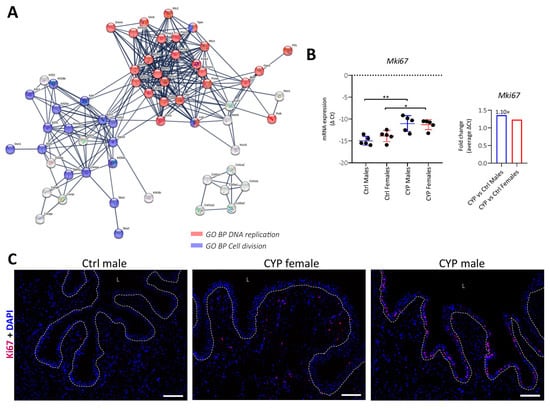 CYP-induced changes in the bladders of male mice. (A) STRING network shows interactions between the putative proteins of the significantly DEGs identified in the enriched GO biological processes involved in cell proliferation (n = 76), displaying only interactions of the highest confidence (0.9). The proteins are known and predicted to interact during DNA replication (red) and cell division (blue). Disconnected nodes are hidden. (B) Left part of the panel: mRNA expression of Mki67 showing more significant upregulation of the transcripts in males compared to females after CYP treatment. Shown are the means ± SD of negative Δ Ct determined for five animals per group. Right part of the panel: fold change of Mki67 mRNA expression in males and females after CYP treatment. (C) Representative images of Ki67 immunolabeled sections of the bladder wall of Ctrl male, CYP female, and CYP male show the differences in the distribution of Ki67-positive nuclei in the bladder wall. The dotted line represents the basal lamina. L; lumen of the bladder. Scale bar: 100 µm. * p < 0.05; ** p < 0.01.