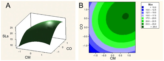 Through preliminary experiments, with 10% (w/v) cottonseed molasses and 6% (v/v) cottonseed oil as the base point, 13 settings were designed for SL production, and the common fermentation medium (CFM) containing glucose and oleic acid was used as the control. Variable combinations and fermentation results were shown in table in Section 3.6, and the results of response surface optimization were shown in Figure 1. It could be seen that when the concentration of cottonseed molasses was 12% (w/v) and the cottonseed oil concentration was 7% (v/v), the two-factor response surface experiment had the maximum value. At this time, the titer of SLs was higher than 48.1 g/L, and the production of lactonic SLs was higher than 25.0 g/L. In the meantime, the titer of total SLs and lactonic SLs was 46.2 ± 0.9 g/L and 24.7 ± 1.2 g/L in the control group, respectively. The SL yields produced from cottonseed molasses and cottonseed oil fermentation medium increased by more than 6% compared with what was produced from glucose and oleic acid. In addition, no inorganic salts and nitrogen sources were added to the fermentation media. As a result, the production cost of SLs is further reduced.