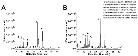 HPLC profiles of SLs produced from glucose fermentation medium and CM fermentation medium by S. bombicola. (A) HPLC profiles of SLs produced from glucose fermentation medium. (B) HPLC profiles of SLs produced from CM fermentation medium. Six main SL components (1, 2, 3, 5, 6, 7) were both produced in the medium with glucose or that with cottonseed molasses, while SL Component 4 can only be produced in the medium with cottonseed molasses.