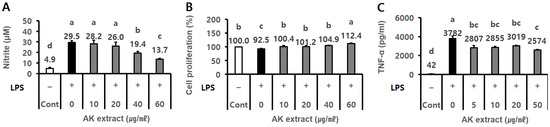 Effect of AK extract on (A) NO production, (B) cell proliferation in LPS-treated BV2 microglial cells, and (C) TNF-α level in LPS-treated RAW264.7 cells. Cells (2 × 105 cells/mL for BV2, 3 × 105 cells/mL for RAW264.7) seeded in a 48-well plate were treated with sample extracts for 2 h, and serum-free medium was used as the control. The wells were treated with 0.5 µg/mL LPS for 21–24 h. The optical density for the analysis of nitrite (n = 3), cell proliferation (n = 3), and TNF-α (n = 2) was measured at 520 nm, 540 nm, and 450 nm, respectively. (–), LPS-untreated experiment; (+), LPS-treated experiment; LPS, lipopolysaccharide; Cont, control; Statistical analysis was performed using SAS software. The values indicated with different letters were found to differ significantly at p < 0.05 by Duncan’s multiple range test.