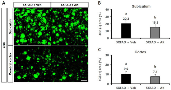 Inhibitory effects of AK extract on the β-amyloid accumulation in the subiculum and deep cortical layer in 5XFAD mice analysed by immunohistochemistry with 4G8 antibodies. (A) Photographs of amyloid plaques in brain parts dyed with 4G8 antibody; (B) Intensity of the 4G8 antibody-positive area in the subiculum; Scale bar = 50 μm. (C) Intensity of the 4G8 antibody-positive area in the cortex. 5XFAD +Veh: control group and 5XFAD + AK extract: AK extract group (n = 5). AK extract 200 mg/kg/day was orally administered for 21 days. Statistical analysis was performed using SAS software. The values marked by different letters were observed to differ significantly at p < 0.05 by Duncan’s multiple range test.