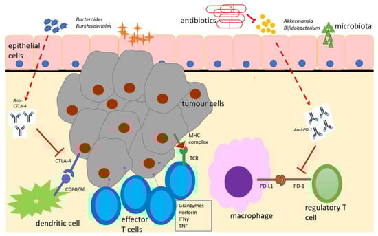 Schematic representation of the microbiome with immunotherapeutic agents (anti-PD-1 and anti-CTLA-4), antigen-presenting cells and effector cells in the tumour immune microenvironment. Adapted from [70]. Beneficial microbiota boost the effects of immune checkpoint inhibitors, which, in turn, suppress regulatory T-cell responses and enhance effector T-cell responses to encourage tumour cell lysis. Antimicrobial therapy suppresses beneficial microbiota and diminishes this response. CTLA-4 = cytotoxic T-lymphocyte antigen-4. IFNγ = interferon gamma. MHC = major histocompatibility complex. PD-1 = programmed cell death -1. PD-L1 = programmed cell death ligand 1. TCR = T-cell receptor.
