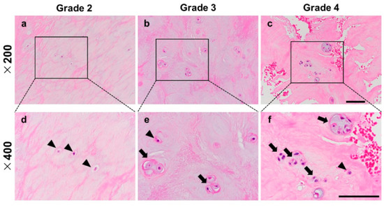 Representative histology of the human nucleus pulposus (NP) stained by H-E. NP tissue classified in Pfirrmann grade 2 (a,d), Pfirrmann grade 3 (b,e), Pfirrmann grade 4 (c,f). The arrowhead indicates single cells, and the arrow indicates cell clusters. (a–c): ×200 magnification, (d–f): ×400 magnification. Scale bar: 100 μm.