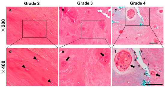 Representative histology of the human NP stained by Safranin-O. NP tissue classified in Pfirrmann grade 2 (a,d), Pfirrmann grade 3 (b,e), Pfirrmann grade 4 (c,f). The arrowhead indicates single cells, the arrow indicates cell clusters, and the asterisk indicates micro-fissures. (a–c): ×200 magnification, (d–f): ×400 magnification. Scale bar: 100 μm.