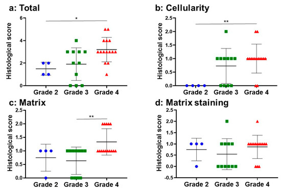 Histological classification of human NP tissues by Pfirrmann classification. (a): total, (b): cellularity, (c): matrix, (d): matrix staining. Grade 2 (n = 4), grade 3 (n = 11), grade 4 (n = 15). * p < 0.05, ** p < 0.01, Kruskal–Wallis test.